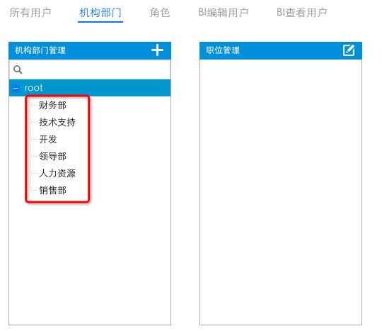 在导入用户的时候,已选择使用服务器数据集中的部门、职务字段,导入完毕后,机构部门会自动生成,可以直接使用该机构部门进行权限分配;如下图: