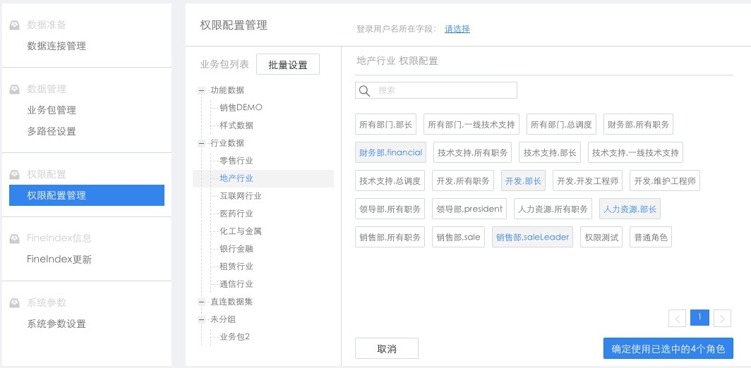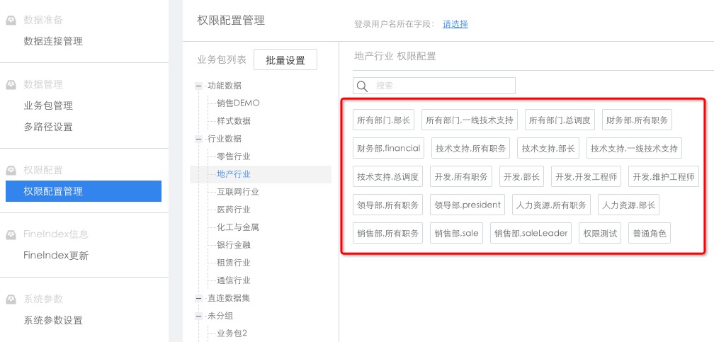 点击数据配置>权限配置管理,进入业务包权限分配界面,选中“地产行业”业务包,如下图: