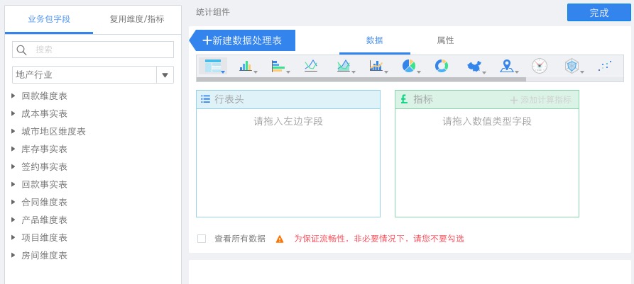 以开发-部长账号登录,点击,新建一个仪表板,拖曳一个组件至仪表板页面,并为该组件添加数据,如下图,可以看到在数据添加界面,可以使用“地产行业”业务包: