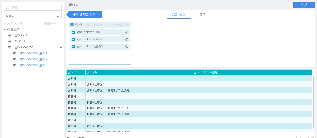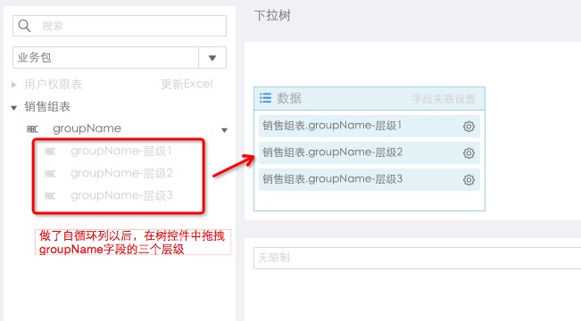 在业务包中对销售组表添加自循环列,将销售组分为三层后,点击新建分析,分别拖拽下拉树组件及明细表,如下图所示: