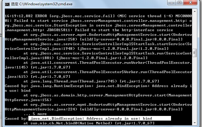 启动wildfly之后,可能会在后台看到如下图所示报错,报错显示地址被占用。