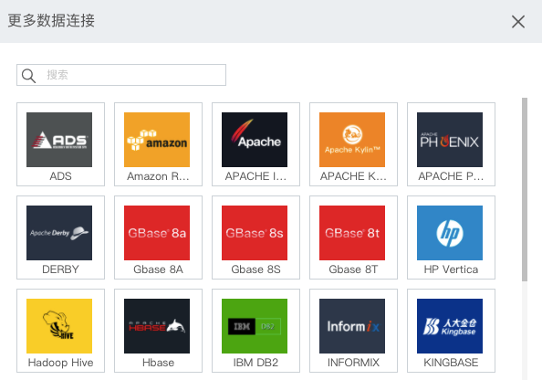 其中更多数据连接不仅包含列表中常用的数据连接,也包含一些不常用的,如:ADS、Amazon Redshift、APACHE IMPALA、Apache Phoenix、Gbase 8A、Gbase 8S、Gbase 8T、Hadoop Hive、KINGBASE、Presto、SAP HANA、SAP Sybase、SPARK、TRANSWARP INCEPTOR、Hbse。