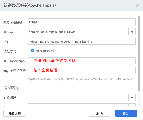 其中APACHE IMPALA、Hadoop Hive、SPARK、TRANSWARP INCEPTOR(星环)、APACHE Phoenix、Hbase这六个数据库在配置数据连接时均支持kerberos认证,在配置数据连接页面可勾选kerberos认证,并填入注册过kdc的客户端名称和keytab密钥路径,比如客户端principal:testuser@HBZQ.COM,keytab秘钥路径:C:\Program Files\FineBI\webapps\WebReport\WEB-INF\resources\testuser.keytab;若不勾选,则不使用kerberos认证,跟其他数据库设置一致。