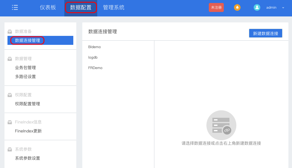 拥有BI数据配置权限的用户登录系统http://localhost:37799/WebReport/ReportServer?op=fs,一般是管理员,点击进入BI数据配置界面,单击,如下图: