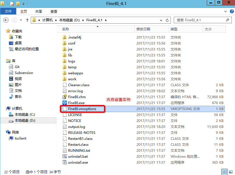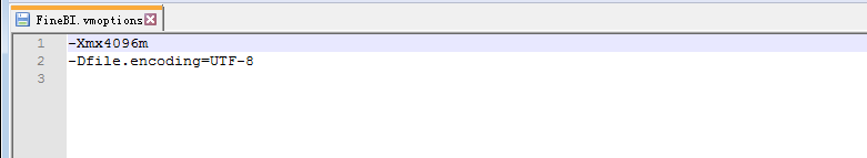 FineBI的安装包自带tomcat的配置环境,通常独立部署在服务器上,只需将其安装在服务器电脑上启动即可。这个时候,为了充分利用服务器的内存,通常要调整Tomcat的分配内存。通常默认的是4G的内存。其配置文件是/FineBI/FineBI.vmoptions如图: