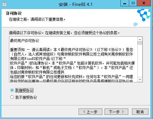 从FineBI官网下载最新版本的.exe文件。双击FineBI安装文件,会加载安装向导,安装向导加载完后,弹出如下对话框: