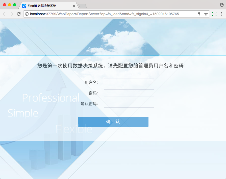 至此,BI已安装完成并启动,可以用浏览器器登录地址IP+端口(37799)+WebReport/ReportServer?op=fs即可登录BI平台。