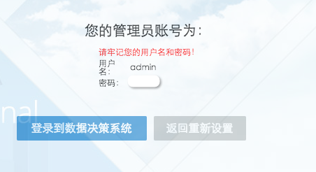进入配置管理员用户名和密码界面,输入用户名、密码和密码确认,点击确认保存设置,会出现设置成功页面,如下图,点击登陆到数据决策系统即可登录成功。
