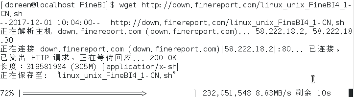 在linux命令行下,使用:wget http://down.finereport.com/linux_unix_FineBI4_1-CN.sh,回车就会开始下载