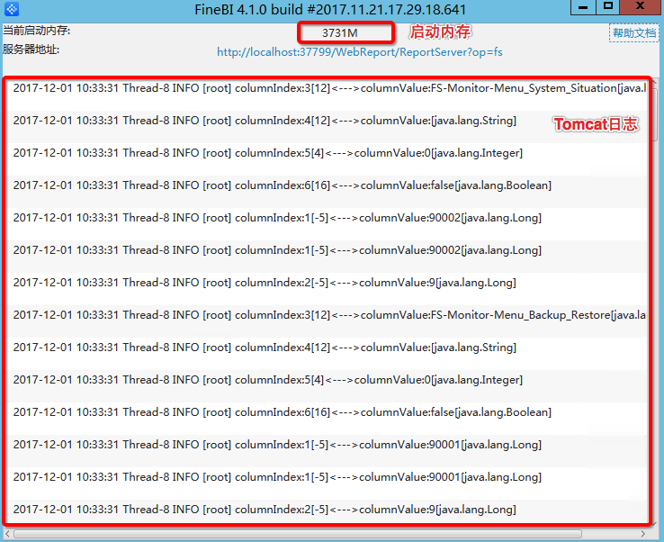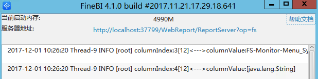 当tomcat服务器开启以后,会自动弹出浏览器地址:http://localhost:37799/WebReport/ReportServer?op=fs 打开BI平台。注:在BI的使用过程时不可将Tomcat窗口关闭,关闭即意味着退出FineBI,如图: