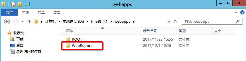 5.3 Web工程FineBI是一个Servlet应用,通常会作为web工程布署到web服务器上。在当前的安装包中,web工程所在的路径为\FineBI\webapps下的WebReport文件(详见FineBI工程目录结构),布署默认是使用内置的Tomcat服务器,如图: