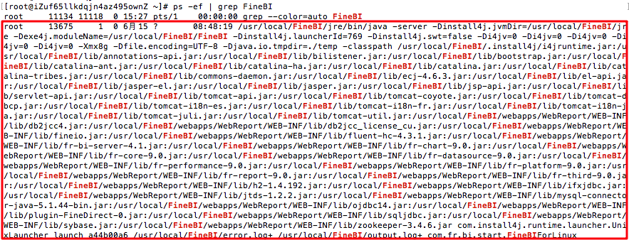 在Linux中没有对应的前端界面来关闭FineBI,需要使用命令ps -ef | grep FineBI来查看java进程对应的PID,如下图,FineBI进程对应的PID为13675。