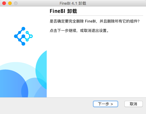 以上为windows系统中的卸载步骤,若在mac系统中,需要在根目录下找到FineBI卸载程序双击卸载,步骤与上述一致;Linux系统中,进入安装根目录,找到uninstall.sh文件,执行命令./uninstall.sh并按提示输入对应信息即可。