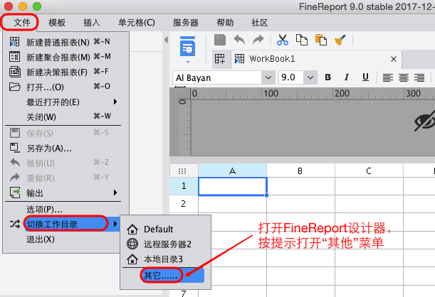 下载安装好Finereport设计器之后,我们需要将Finereport设计器与BI的服务器远程连接。首先打开设计器,在菜单栏中选择文件>切换工作目录>其他,如下图所示: