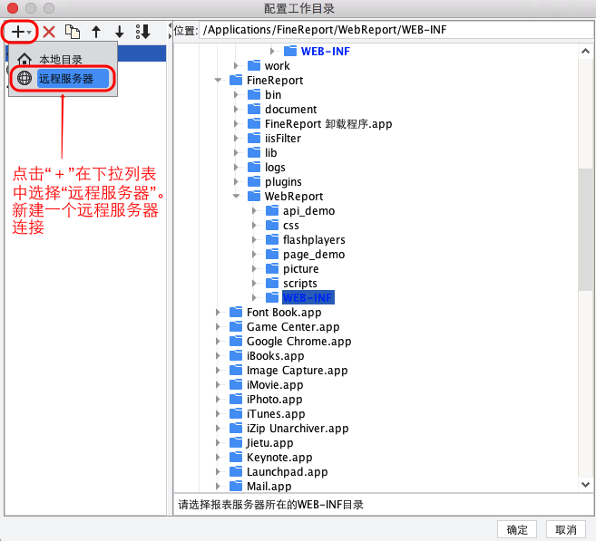 在弹出的配置工作目录的界面中,点击“+”>远程服务器来新建一个远程服务器连接,如下图: