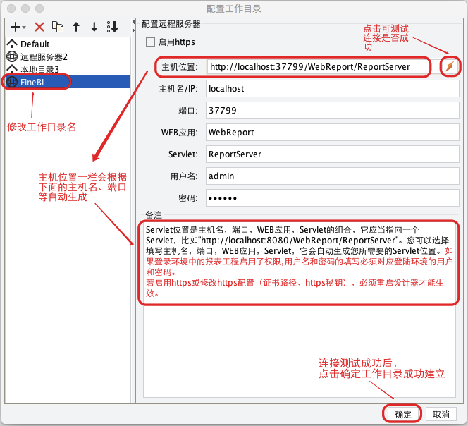 可以看到新增了一项远程服务器连接,并且它的右侧界面出现了远程服务器的连接配置。我们将远程服务器连接名修改为“FineBI”,填入需要的配置信息。点击测试连接可以看到“连接成功”。点击确定,Finereport与BI的远程连接就建立好了!注:这里的远程服务器的配置信息就是启用BI的信息,包括BI所在的主机名/IP、端口号、WEB应用(默认WebReport)、Servlet(默认ReportServer)已经BI登录的用户名和密码(一般为管理员账户)。