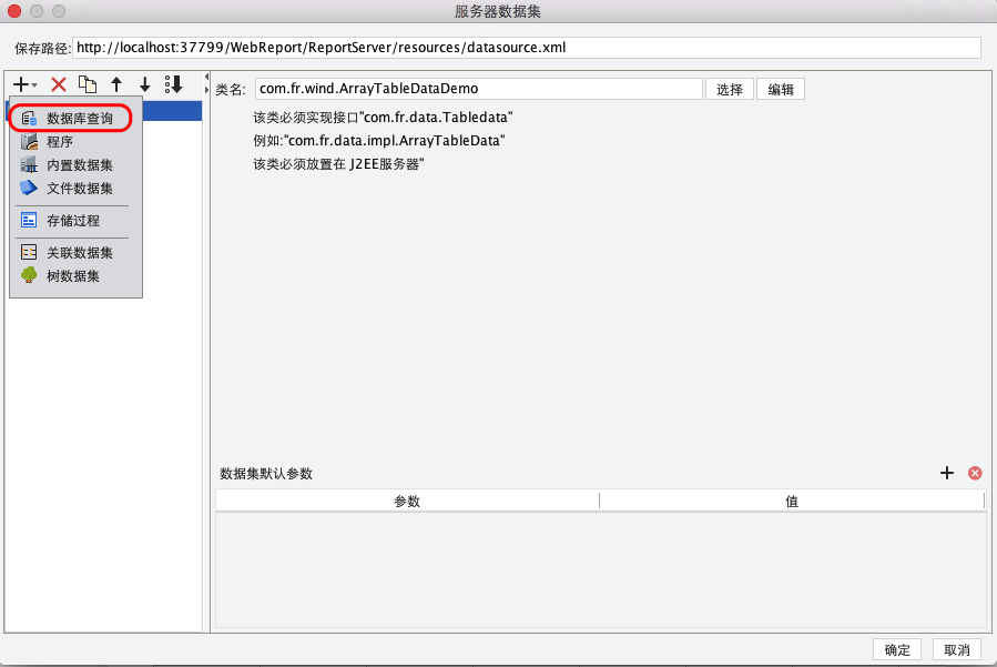 在弹出的服务器数据集配置页面点击“+”>数据库查询: