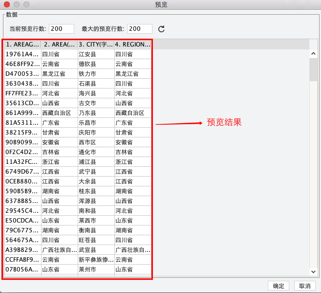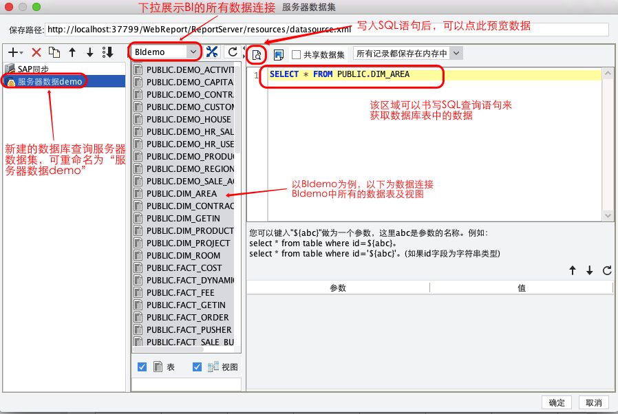 可以看到新增了一项数据库查询项,我们将其重命名为“服务器数据demo”。选择BIdemo数据连接,选择数据表PUBLIC.DIM_AREA,在右侧的sql书写区域写入:SELECT * FROM PUBLIC.DIM_AREA