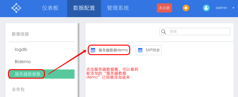 4、服务器数据集使用方法打开BI数据配置>业务包管理界面,新建一个业务包,在弹出的界面的中选择,在右侧的界面就可以看到我们新建的名为“服务器数据demo”的服务器数据集了。