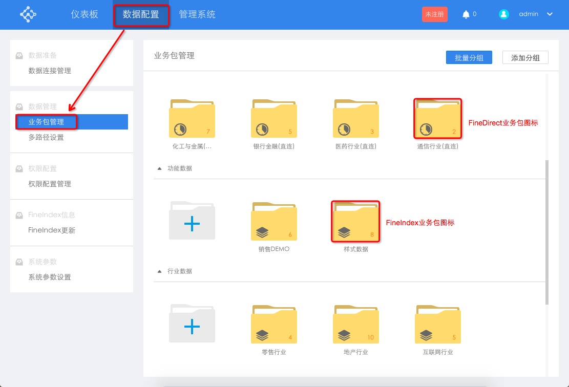 为了提供上述业务包功能特性,FineBI对业务包提供了一系列的设置项,对数据业务包进行数据库转义,建立关联关系,也可以手动选择将数据表中需要使用的字段添加到业务包中。FineBI4.1版本将FineDirect引擎与FineIndex引擎业务包统一放在数据配置>数据管理>业务包管理下,且两种类型业务包的图标显示不一样,如下图: