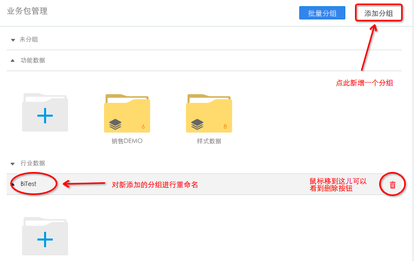 点击数据配置>业务包管理,可以看到默认的业务包是未分组的,点击添加分组按钮可以添加分组,点击批量分组可以设置业务包所在的组别,如下图: