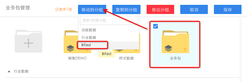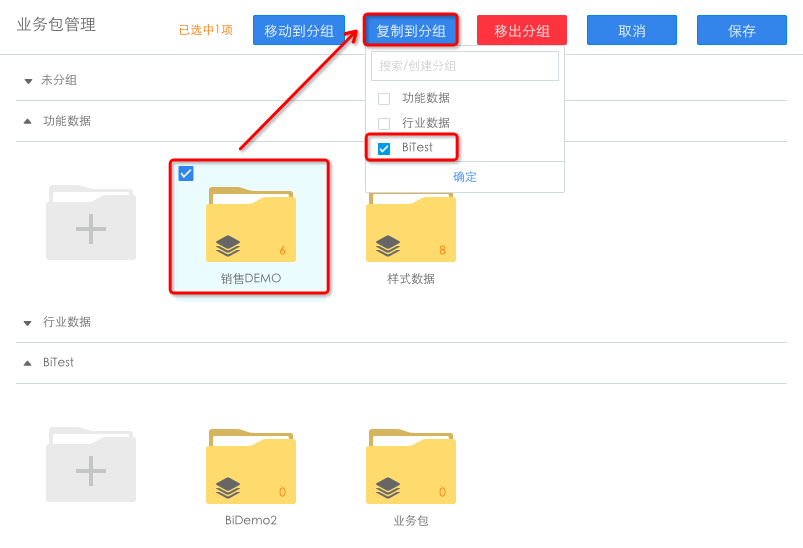 复制到分组是指将一个组内的业务包复制一份至别的分组内,如下图,选中功能数据组内的销售DEMO业务包,点击按钮后面的下拉按钮,下拉选项中罗列出了所有的分组,选择BiTest分组,将该业务包复制到BiTest组内: