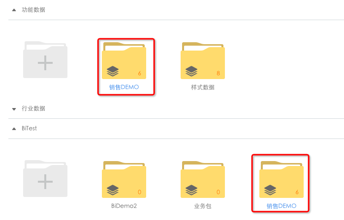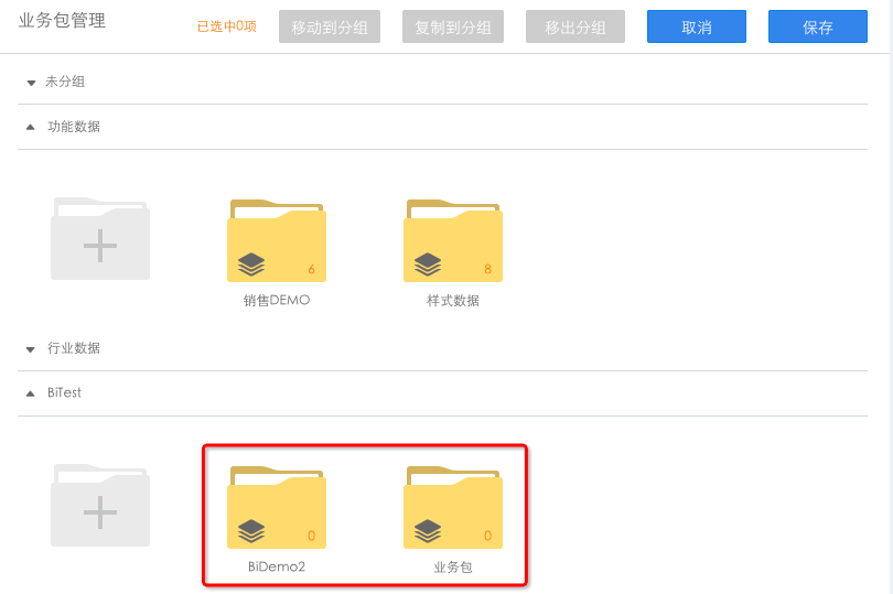 点击确定,可以看到BiTest组内也多了一个销售DEMO业务包,功能数据组内的业务包也还存在,如下图: