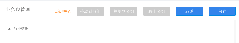 添加分组,并在组内添加业务包之后,需要调整业务包存放组别,想要将其移动到别的分组,或者想要复制一份一模一样的业务包至别 的组内,此时就可以使用批量分组。点击右上角的按钮,进入批量分组界面,如下图,我们可以看到批量分组包括移动到分组、复制到分组和移出分组: