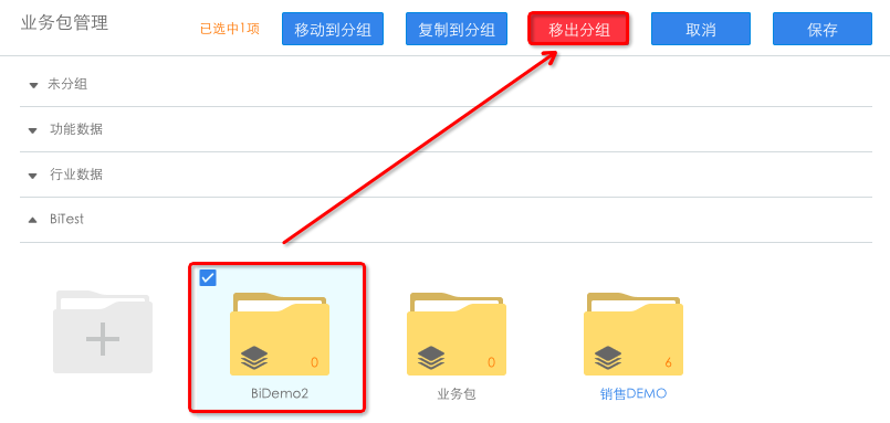 移出分组是指将指定组内的业务包移出该组内,如下图所示,将BiTest组内的BiDemo2业务包移出该组,选中BiDemo2,点击上方的按钮,即可将其移出BiTest分组,该业务包出现在未分组列表中。