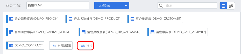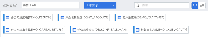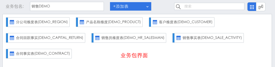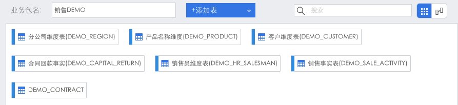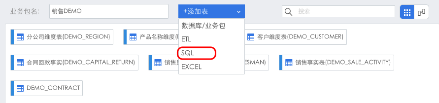 前面将销售DEMO业务包中的合同事实数据表删除了,这里再添加进来。在业务包管理界面点击进入该业务包,点击“+添加表”,选择数据库/业务包。
