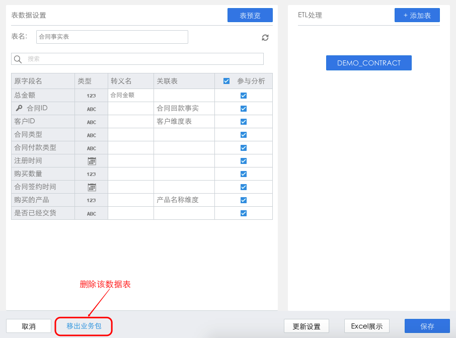 前面给销售DEMO业务包中添加的数据表中合同事实表添加错误,需要删除,该如何操作呢?