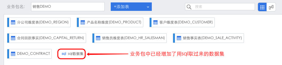 通过SQL语句获取的数据表,我们称之为SQL数据集,以销售DEMO为例,点击数据配置>业务包管理,进入业务包中进行业务包管理,点击“+添加表”下方的按钮。