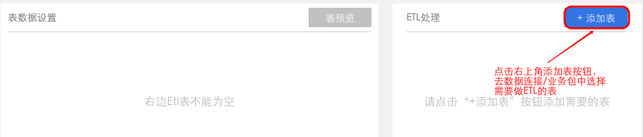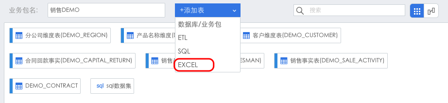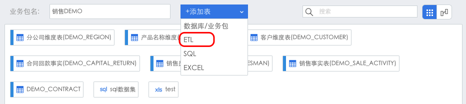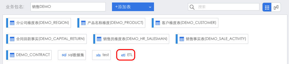 打开销售DEMO业务包,点击“+添加表”下的,进入添加ETL表界面。