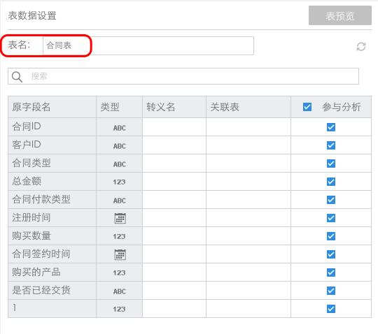点击该ETL表,回到表设置界面,在后面的文本框中可以修改ETL表的名称,比如说合同表,点击保存,如下图: