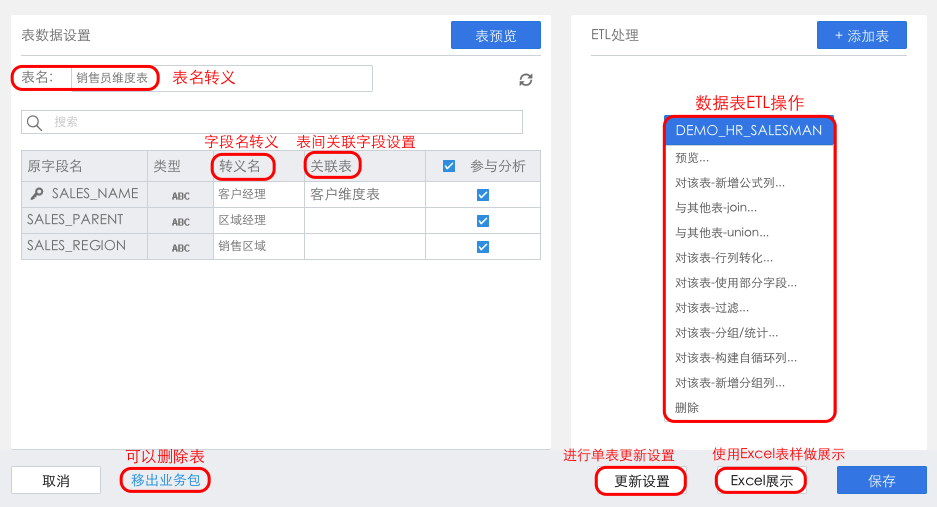 在数据表管理面板中,单击数据表,打开数据表属性设置界面,可对数据表进行一系列的设置,包括手动添加转义、手动建立表间关联关系、字段是否参与分析、ETL处理、Fineindex更新设置和ExcelView数据转义,如下图: