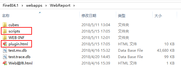 7、插件管理:下载文件scripts.zip或者scripts.rar,解压后将文件夹内的文件(scripts文件夹和plugin.html)放到WebReport目录下。