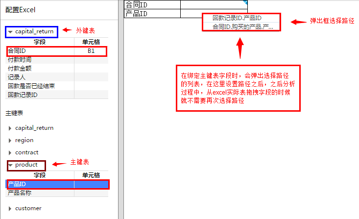 如果为外键表设置ExcelView的转义的时候,要绑定主键表中的字段,并且该外键表到主键表又有多条路径对应,在绑定主键表的字段与单元格的时候,需要选择通过哪条路径来绑定Excel单元格,先通过多路径表间关联关系章节的示例创建一个多路径表间关系,外键表为合同的回款信息,主键表为产品名称,如下图: