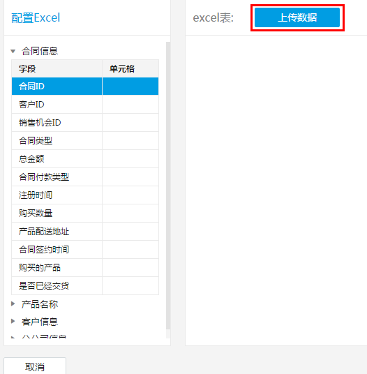 点击Excel展示,弹出配置Excel的界面,点击上传数据,选择上述创建的合同信息.xls,将其导入进来,如下图: