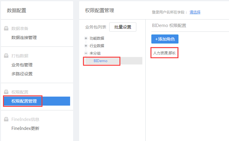 数据绑定完成之后,把BIDemo业务包的使用权限分配给人力资源部长角色。