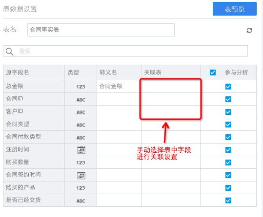 点击表,进入合同事实表管理界面,单击列中的关联表单元格,如下图: