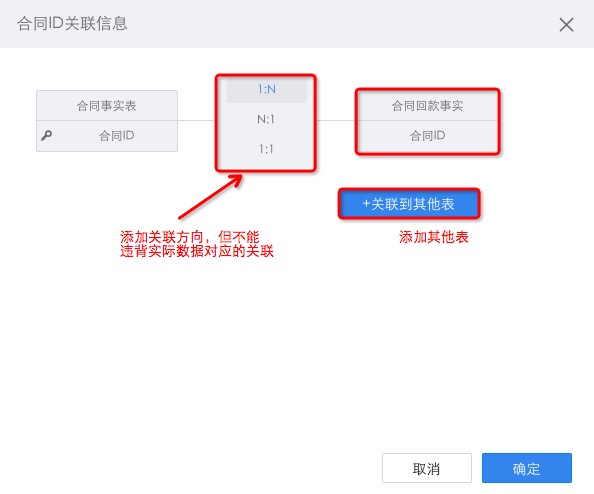 点击需要建关联的字段,如,然后单击进入添加关联页面。在关联界面中,先添加其他表可以与当前字段进行关联的字段,如,此时添加完关联字段后需要选择默认的关联方向,即哪个作为主表,选择完之后点击确定就可以回到表编辑页面并看到关联已经建好。