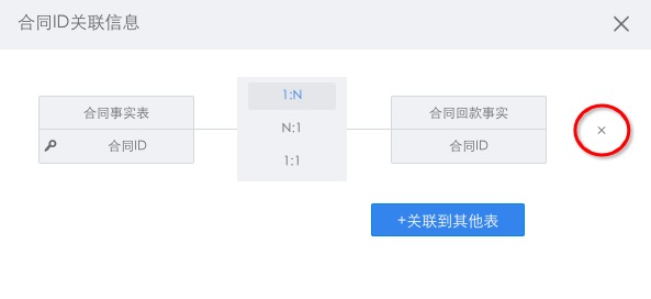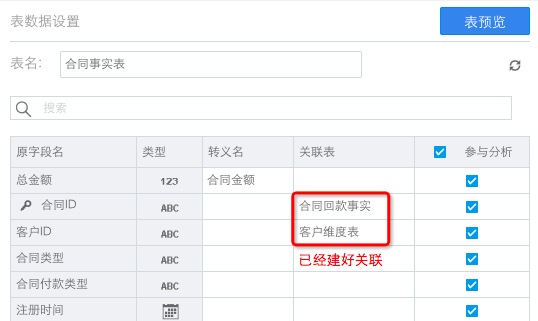在上图中,相对于前面的直接读取数据库关联得到的表间关系,此处多了一对表间关系——合同事实表和合同回款事实表之间的一组关联,即手动添加的表间关联。注:其中带有钥匙标志的表示是在两表关系中属于1的方向,该字段是作为主键出现的,要求字段是distinct。