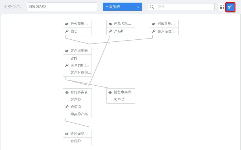 点击保存对业务包的操作,进行FineIndex更新,等待FineIndex更新完毕,在该业务包的关联视图下即可看到该关联已经被添加进去了。3、表间关联关系查看