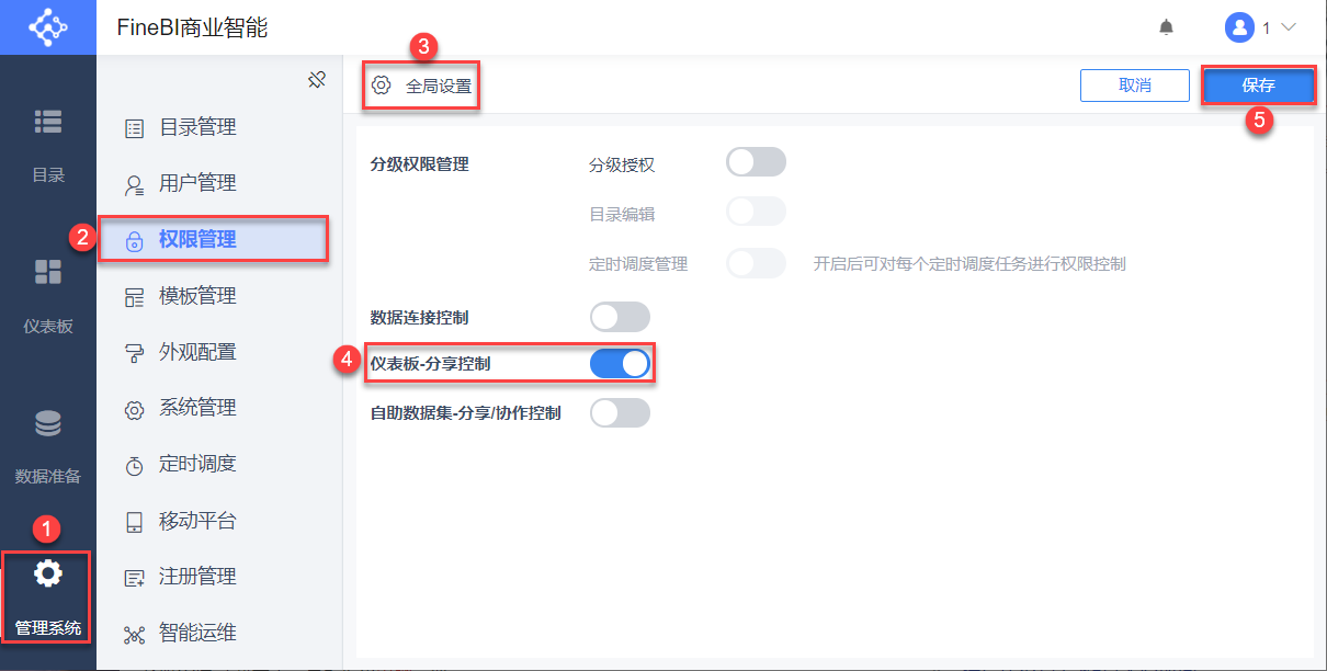 管理员登录数据决策系统,点击「管理系统>权限管理>全局设置」,打开「仪表板-分享控制」,点击「保存」。如下图所示: