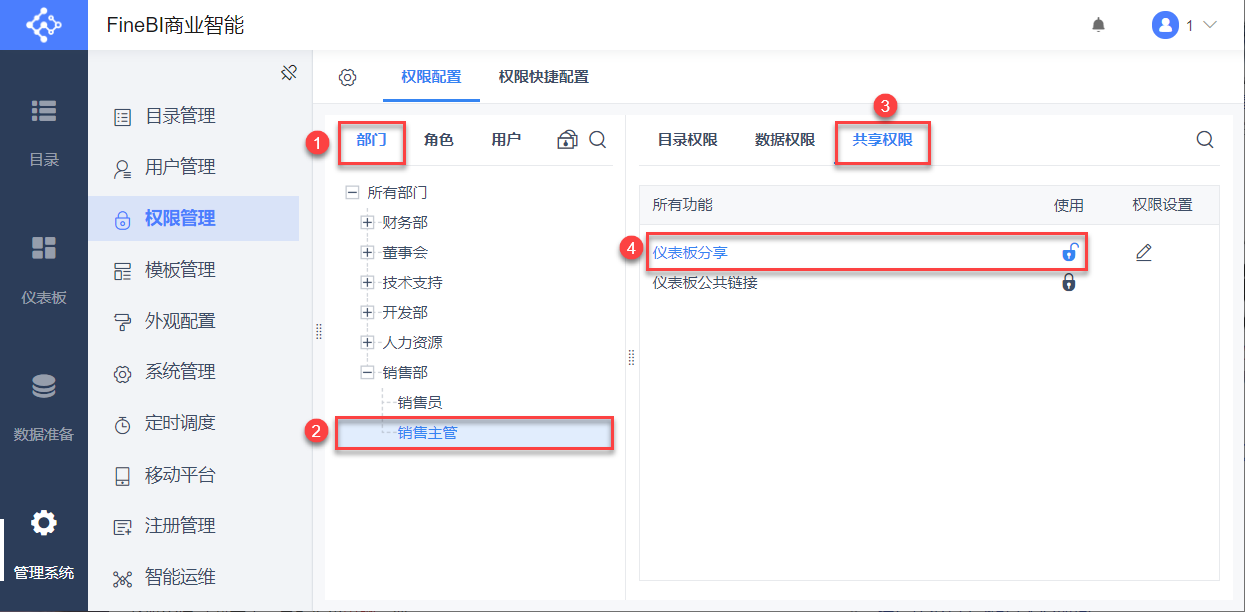 2)为「销售主管」开启仪表板分享权限,选择「部门>销售部>销售主管」,为其开启「仪表板分享」的使用权限,如下图所示: