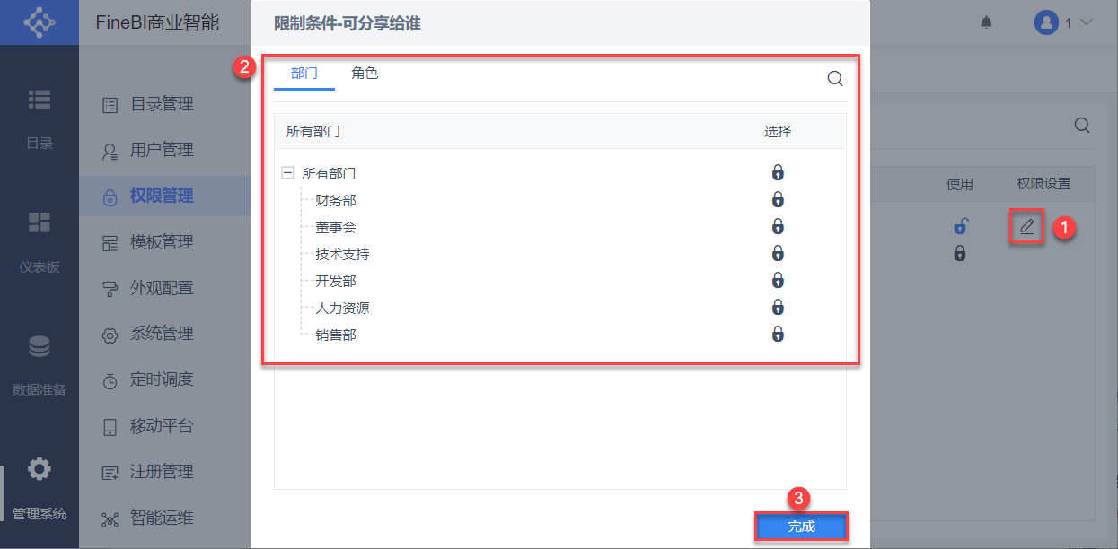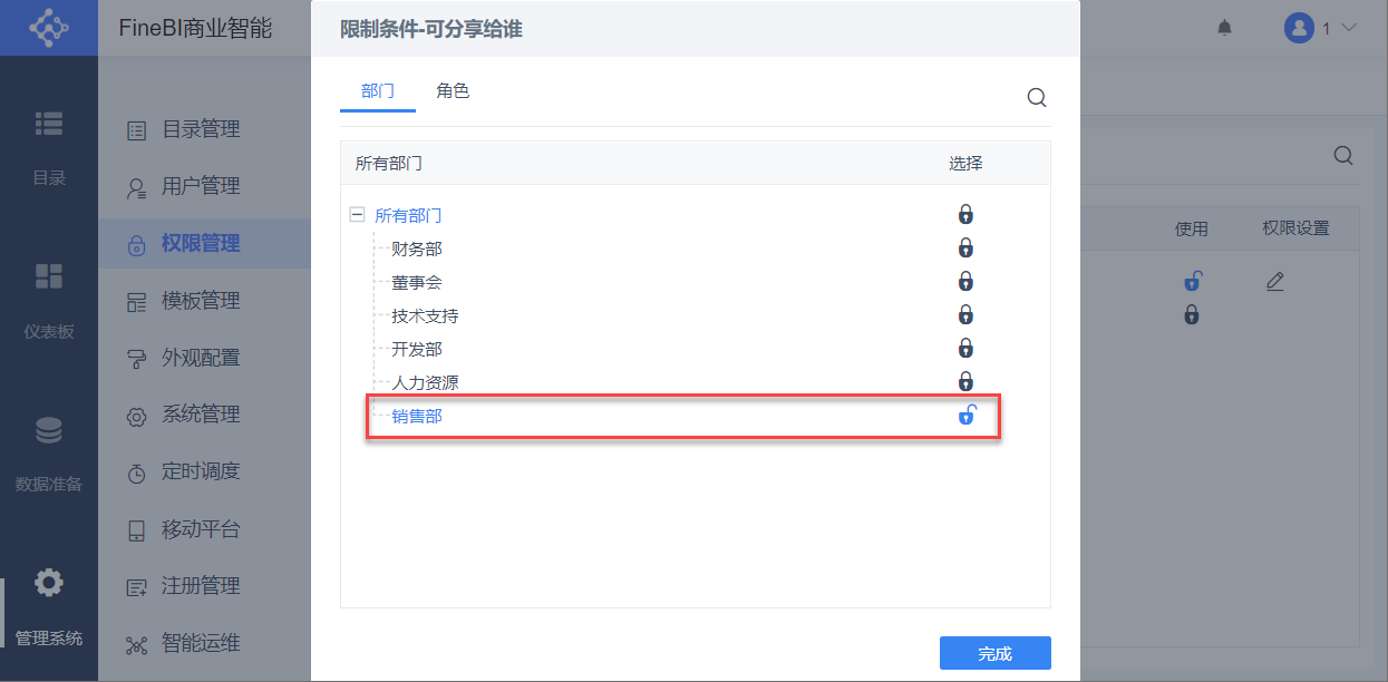4)为销售主管解锁可分享给销售部,解锁权限后自动保存,点击完成,则仪表板分享权限配置完成。如下图所示: