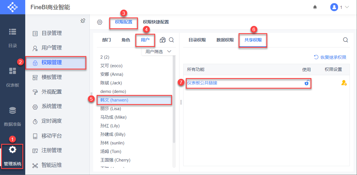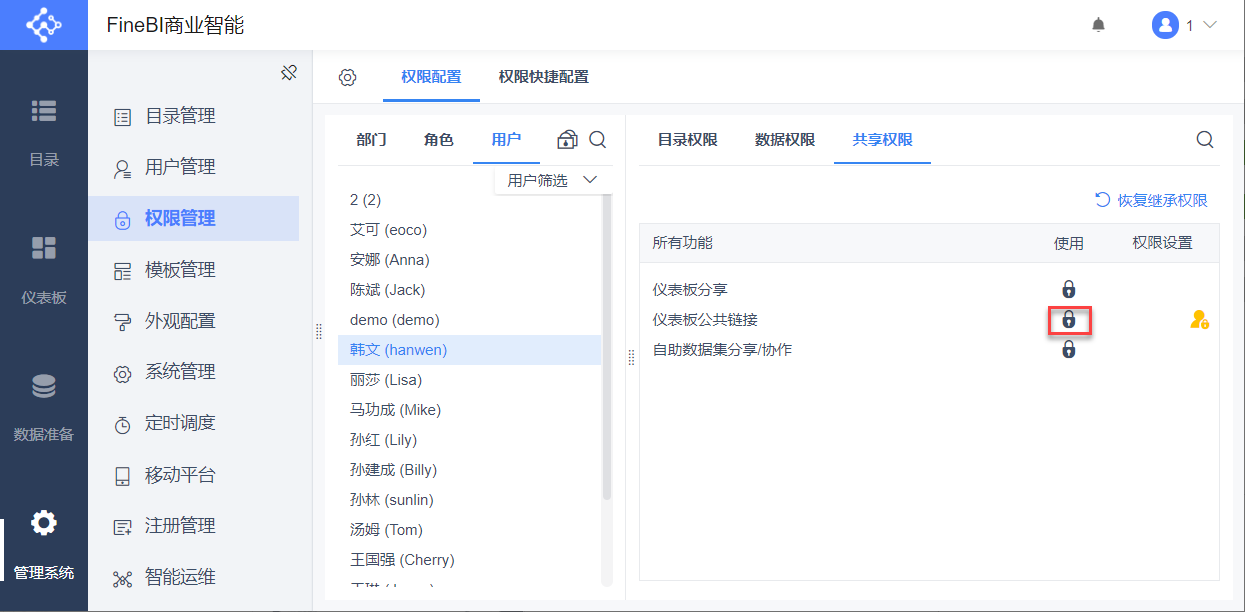 管理员登录数据决策系统,点击「管理系统>权限管理」,在权限配置下选择用户>韩文(hanwen),为其开启「共享权限>仪表板公共链接」的使用权限,如下图所示: