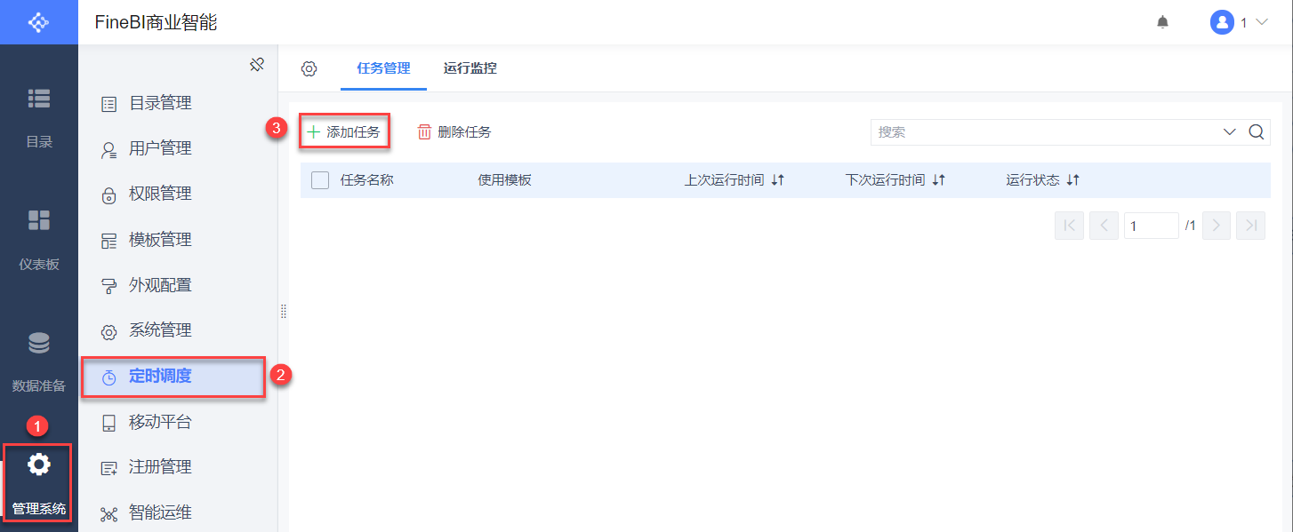管理员登录数据决策系统,点击「管理系统>定时调度>添加任务」,如下图所示: