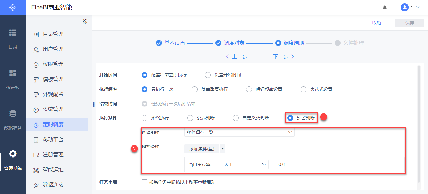 2)「预警判断」支持对组件中参与分析的结果字段设置预警条件。