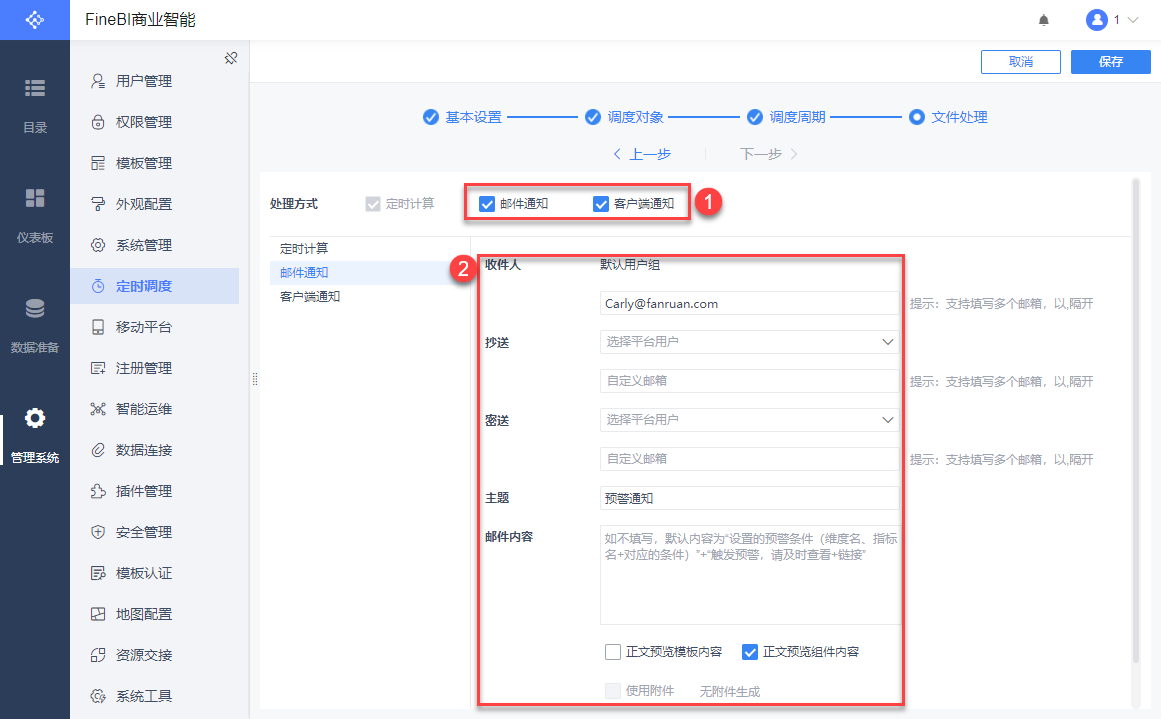2)「预警判断」支持「邮件通知」和「客户端通知」。